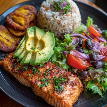 - Servir: Sirve el salm贸n a la parrilla con arroz integral, ensalada, aguacate y pl谩tanos maduros fritos (si lo deseas).