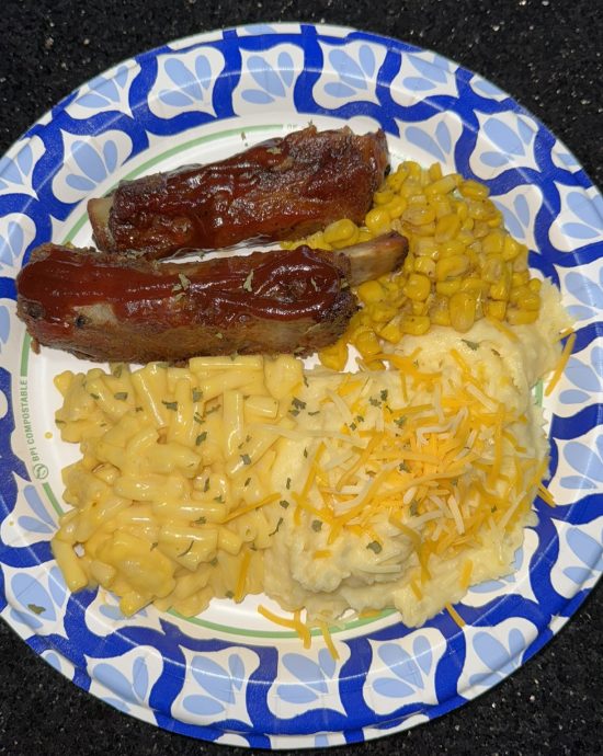 Costillas BBQ con Puré de Papas, Maíz Dulce y Mac & Cheese