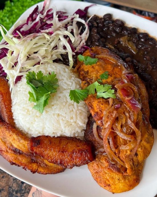 - Preparar los sides: Cocina el arroz blanco segĂșn las instrucciones del paquete. Cocina las habichuelas negras segĂșn las instrucciones del paquete. FrĂe el maduro en aceite caliente hasta que estĂ© dorado. Prepara la ensalada fresca segĂșn tus preferencias.