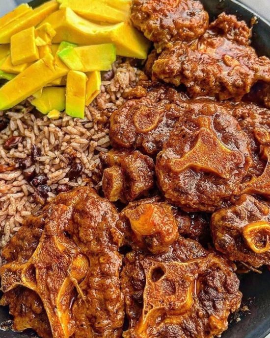 - 3️⃣ Servir: Sirve el rabo guisado sobre una porción de moro caliente, y acompaña con rodajas de aguacate fresco.
